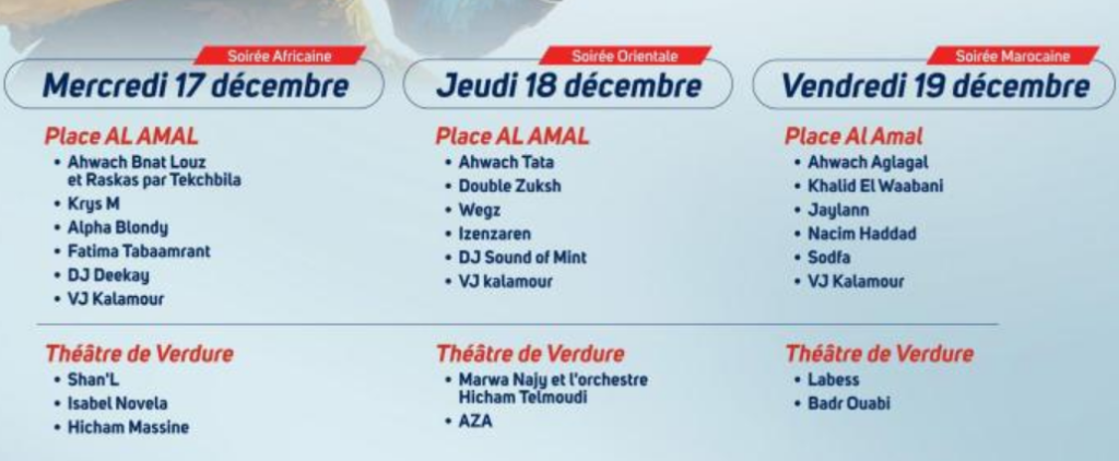 Comme lors des précédentes éditions, tous ces concerts resteront ouverts au grand public et gratuits, dans l’esprit d’un festival populaire qui fait de la rue et des places d’Agadir de véritables scènes à ciel ouvert.
