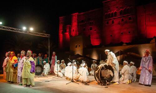 Ahwach Aglagal est une troupe représentative des arts collectifs de l’Anti‑Atlas, où chant, danse, percussions et poésie se combinent dans une forme spectaculaire communautaire.
